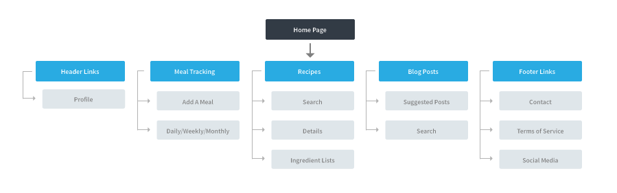 For the web based version of this tool, I wanted to give the users more information and the ability to see more options at once. Since their information can be viewed at a glance on the app and in their profile, I felt it was good to focus on the recipe search and sorting flow, while also providing suggested recipes and blog posts based on their activity.